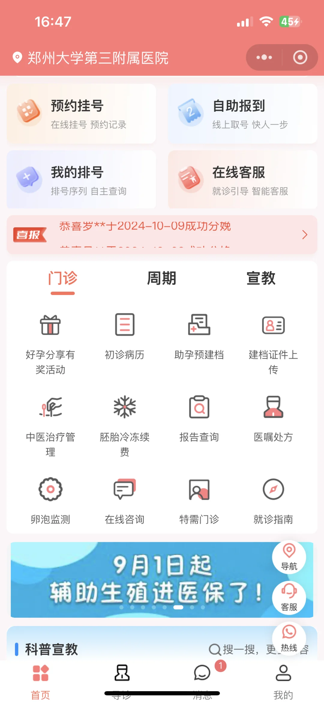 9月6日第四次去医院,挂号让医生看一下染色体结果【挂号费10.5元】